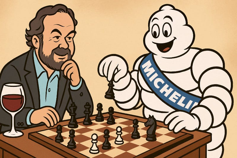 Dacă Michelin, producătorul de anvelope transformat în arbitru mondial al gustului, va reuşi să-şi extindă aria de competenţa de la bucătării la pivniţe şi, poate, să redefinească criteriile de evaluare a vinurilor „peste capul lui Robert Parker”, ei bine, doar viitorul o va spune.